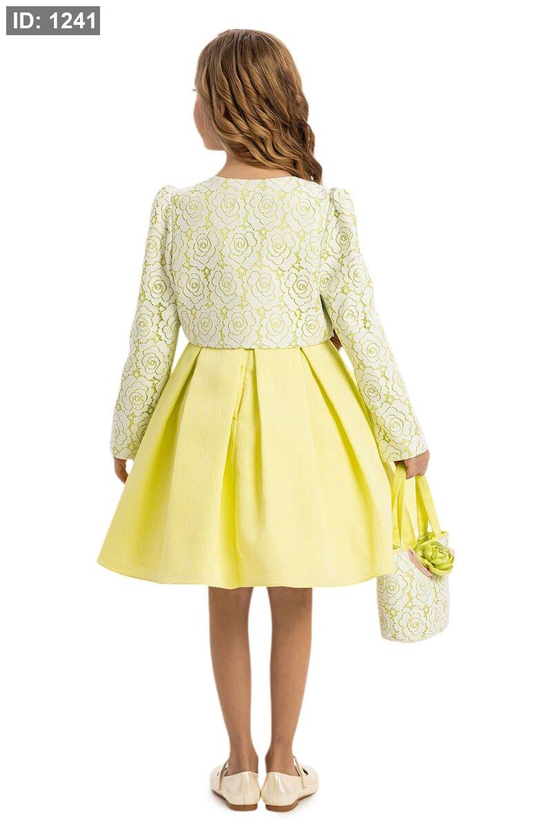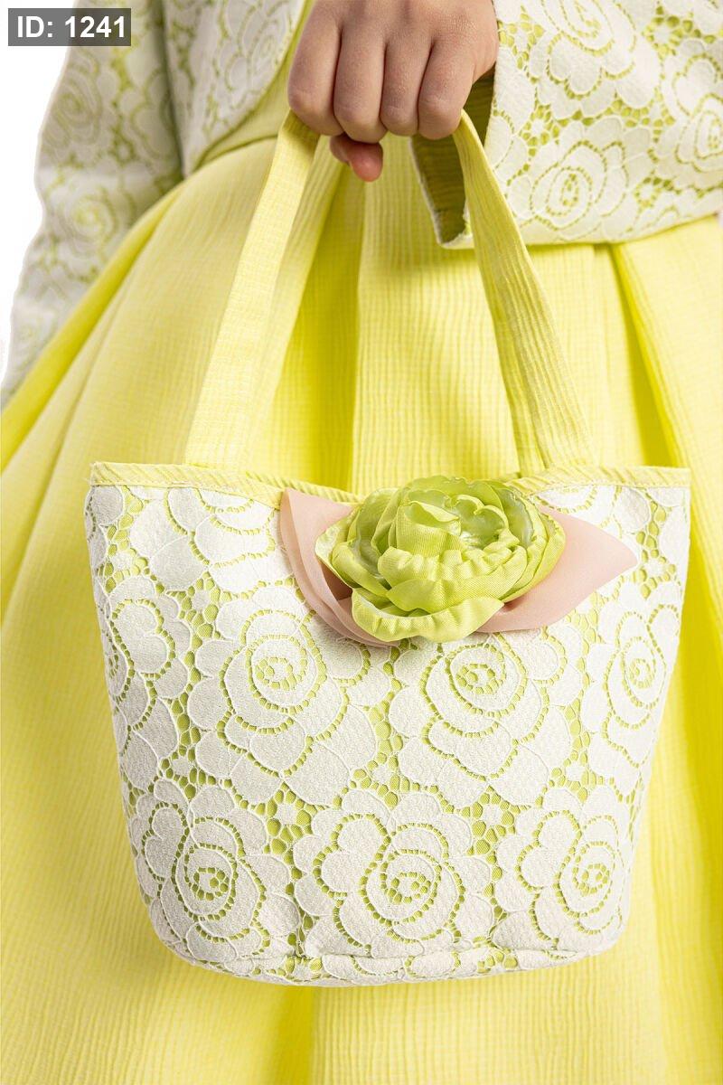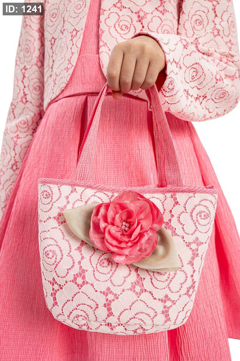- الإكسسوارات: وردة جانبية كبيرة الحجم (3D) على الصدر، مكررة على الحقيبة اليدوية المرفقة.