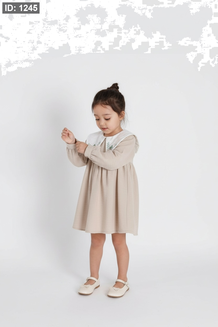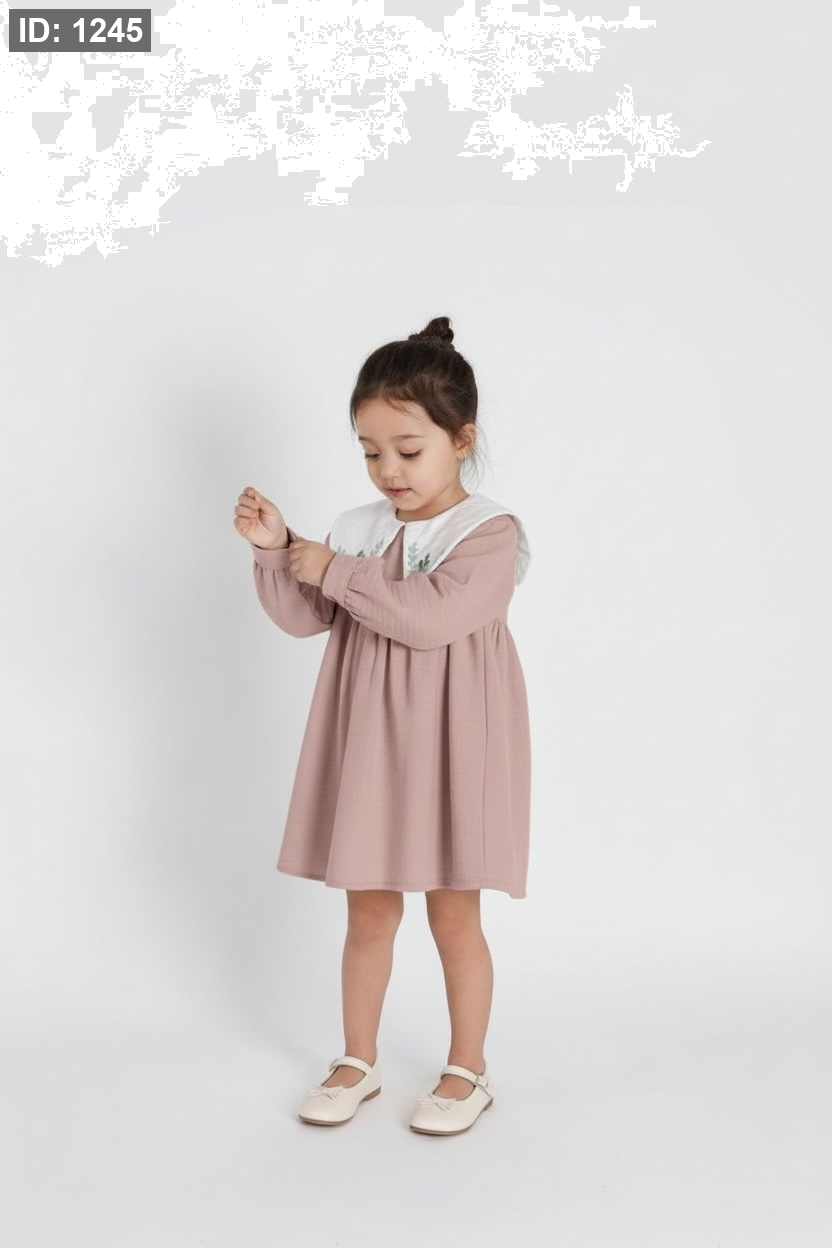 - ياقة "بيتر بان" العريضة - يتميز الفستان بياقة بيضاء كبيرة تمنحه طابعاً كلاسيكياً طفولياً جذاباً.