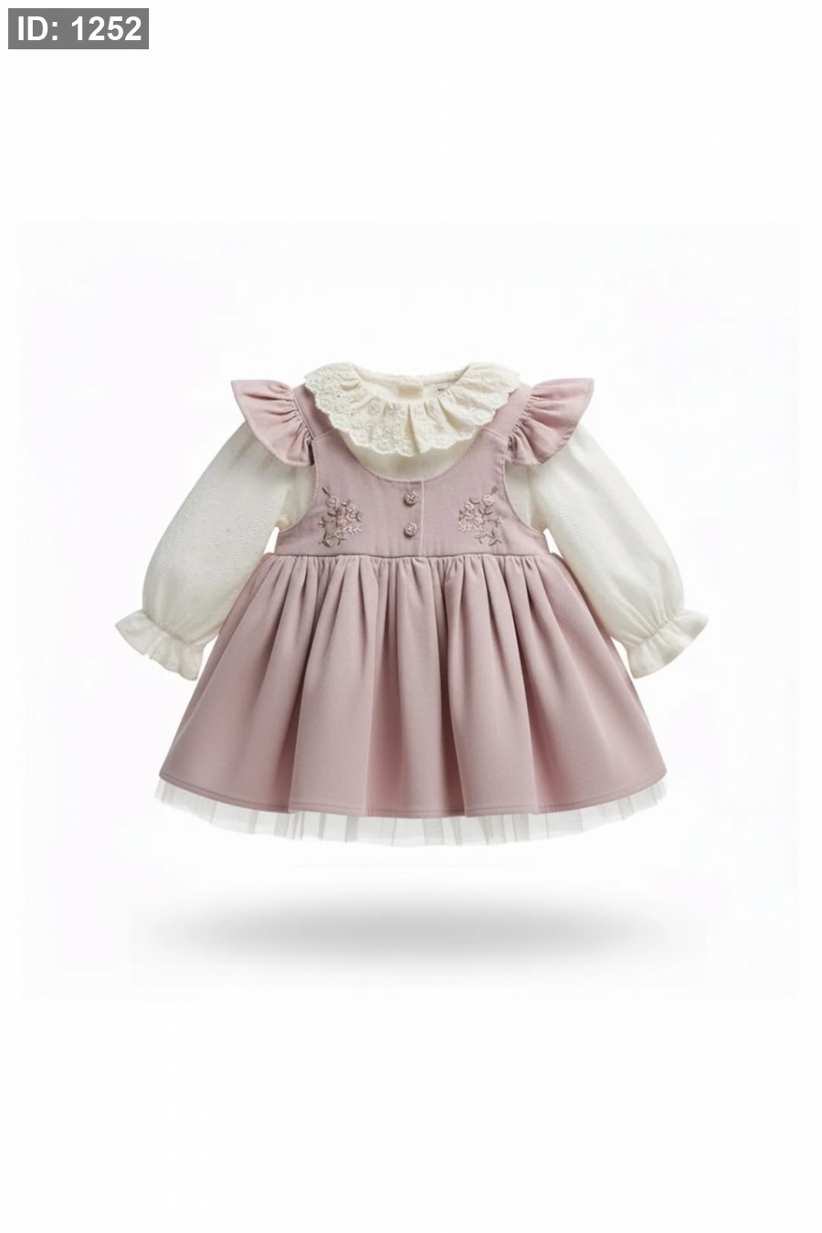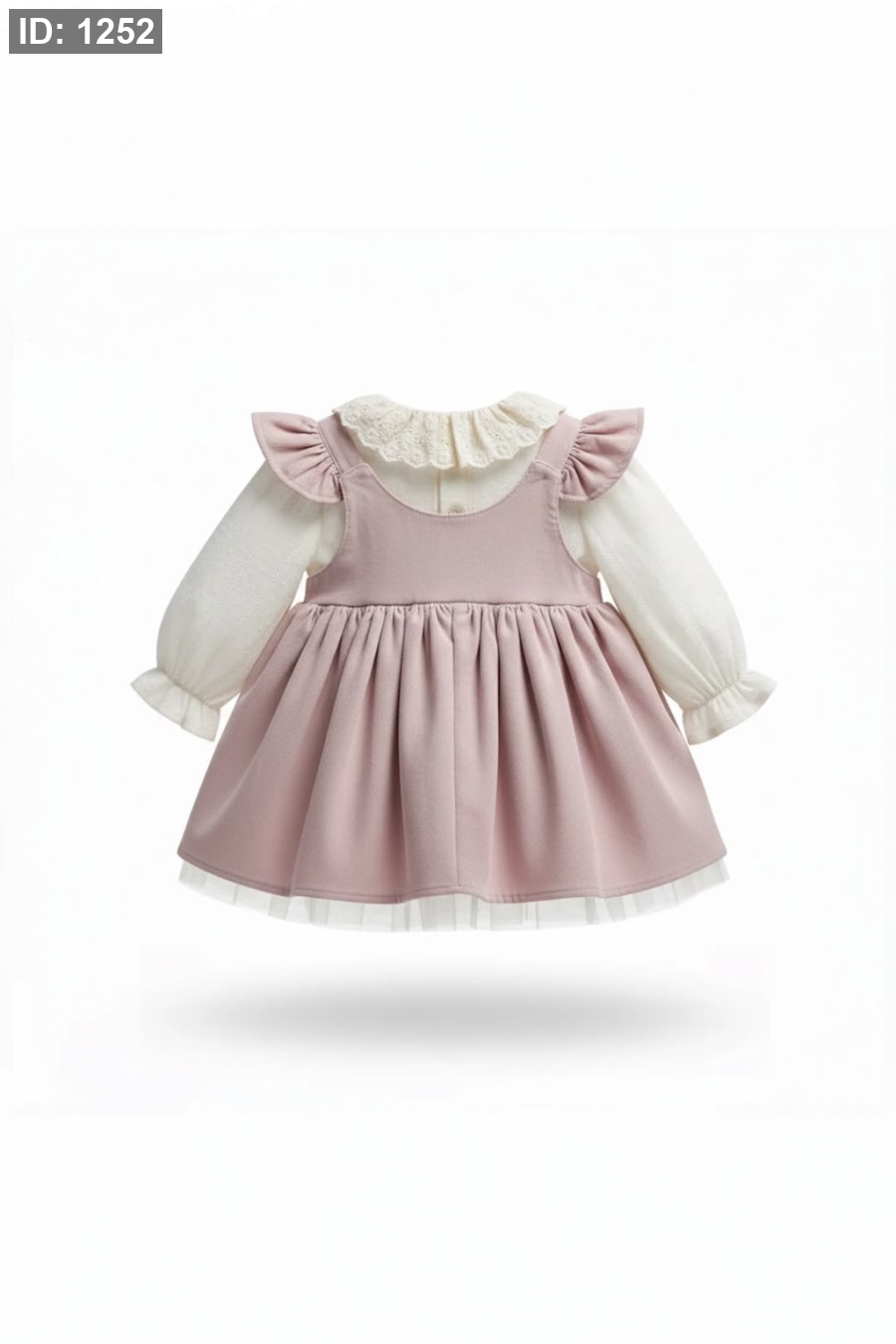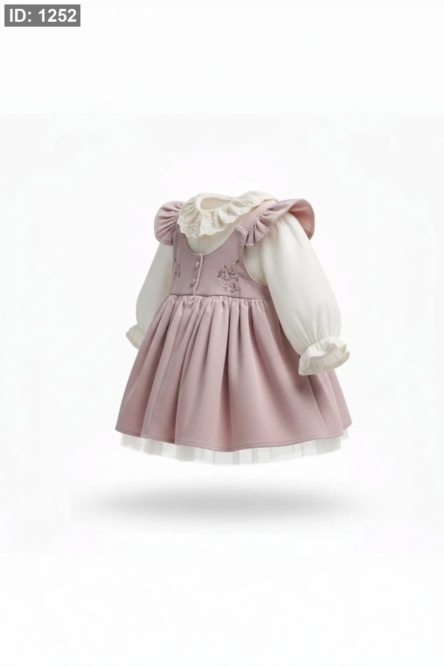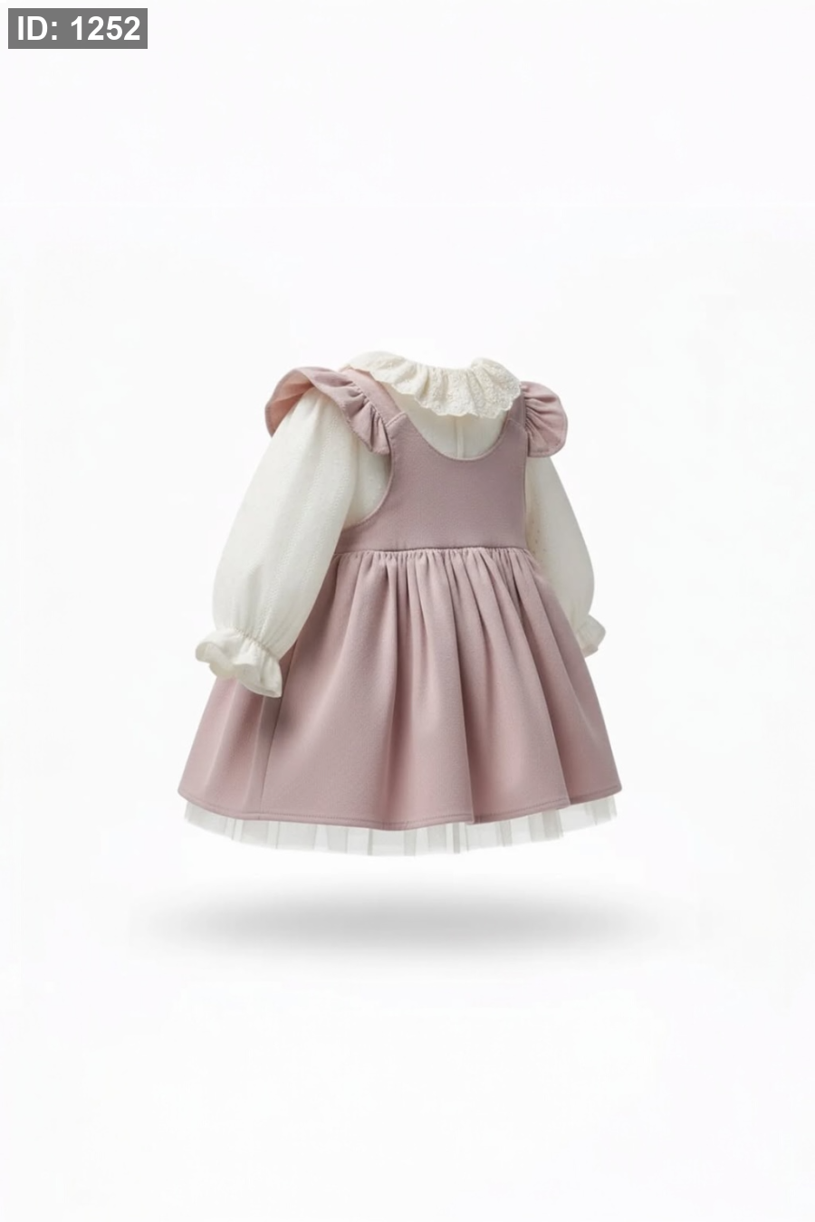 - طقم متكامل مكون من قطعتين - يتألف من قميص أبيض بأكمام طويلة وفستان "سلاوب" وردي ناعم، مما يمنحه مظهراً مرتباً وفخماً.