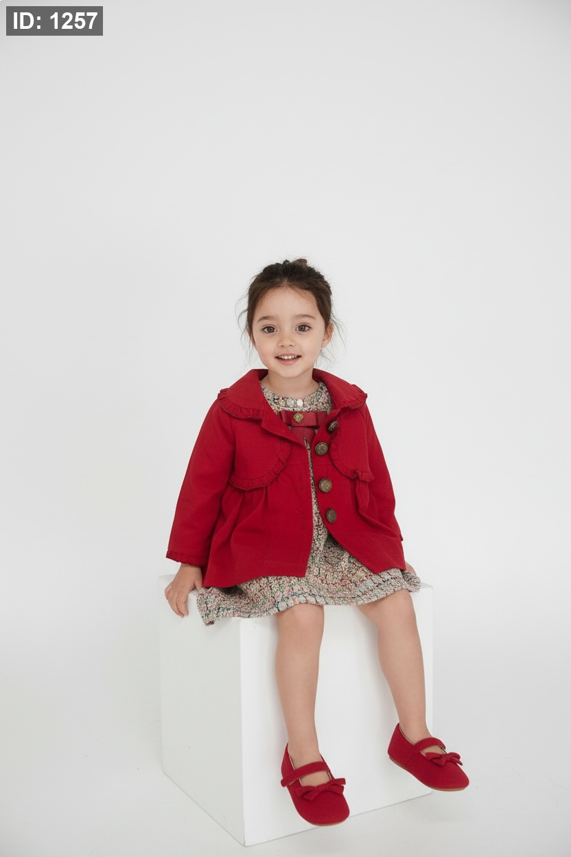 - طقم مكون من 3 قطع (جاكيت وفستان وحذاء) - يأتي الطقم بتنسيق جاهز يجمع بين جاكيت أحمر زاهٍ وفستان من قماش التويد الملون، مما يمنح الطفلة مظهراً متكاملاً وأنيقاً.