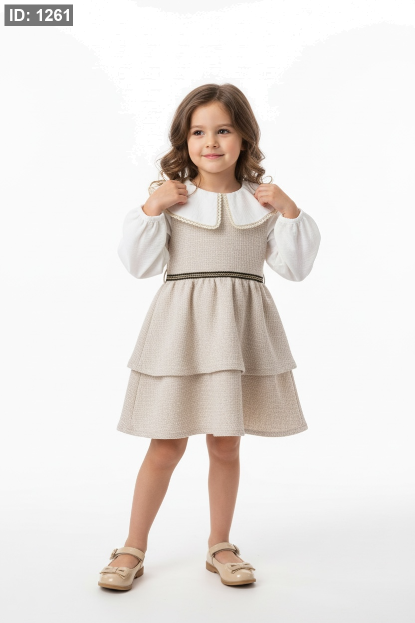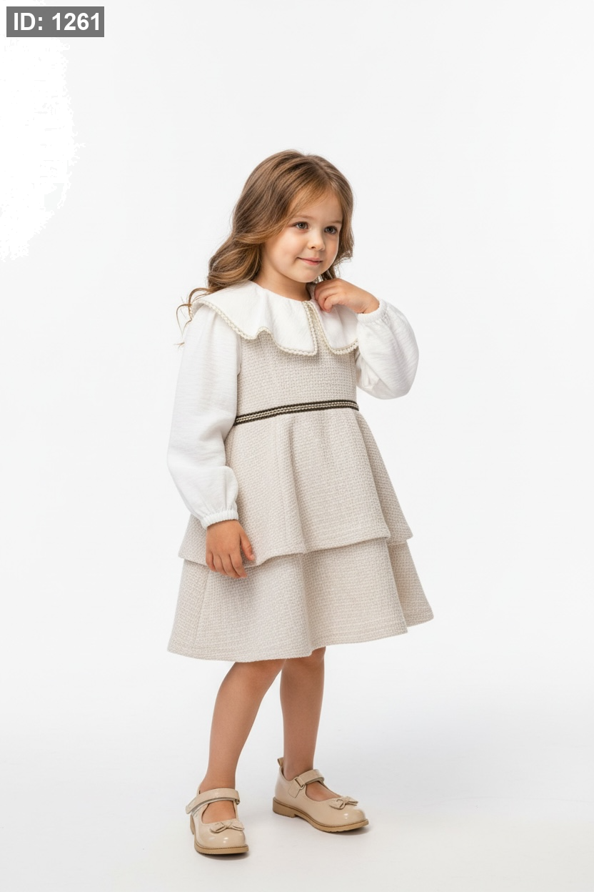- طقم مكون من قطعتين - يتألف من قميص أبيض بأكمام طويلة وفستان "سلاوب" من قماش التويد الفاخر، مما يمنح الطفلة مظهراً متكاملاً ومنسقاً بعناية.