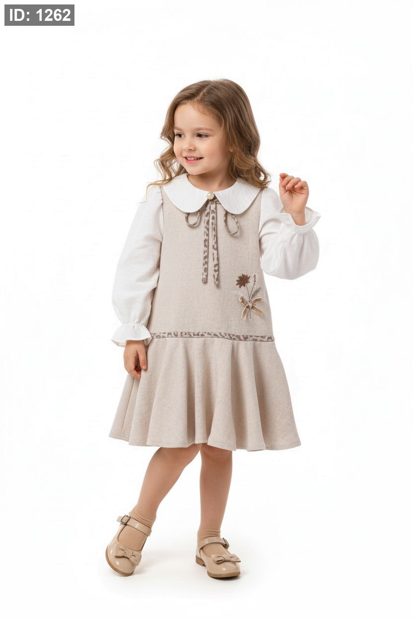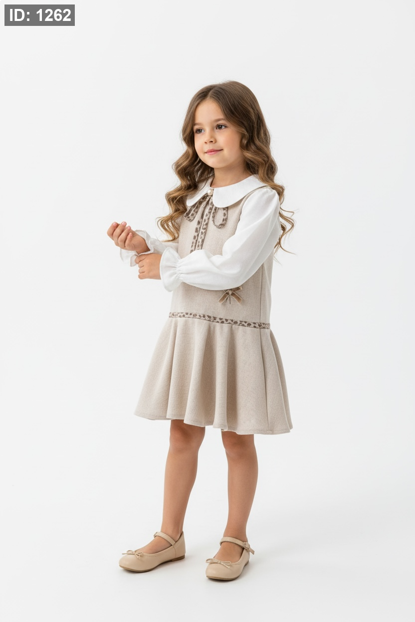 - طقم مكون من قطعتين - يتألف من قميص أبيض ناعم وفستان "سلاوب" باللون البيج الدافئ، مما يسهل عملية التنسيق والارتداء.