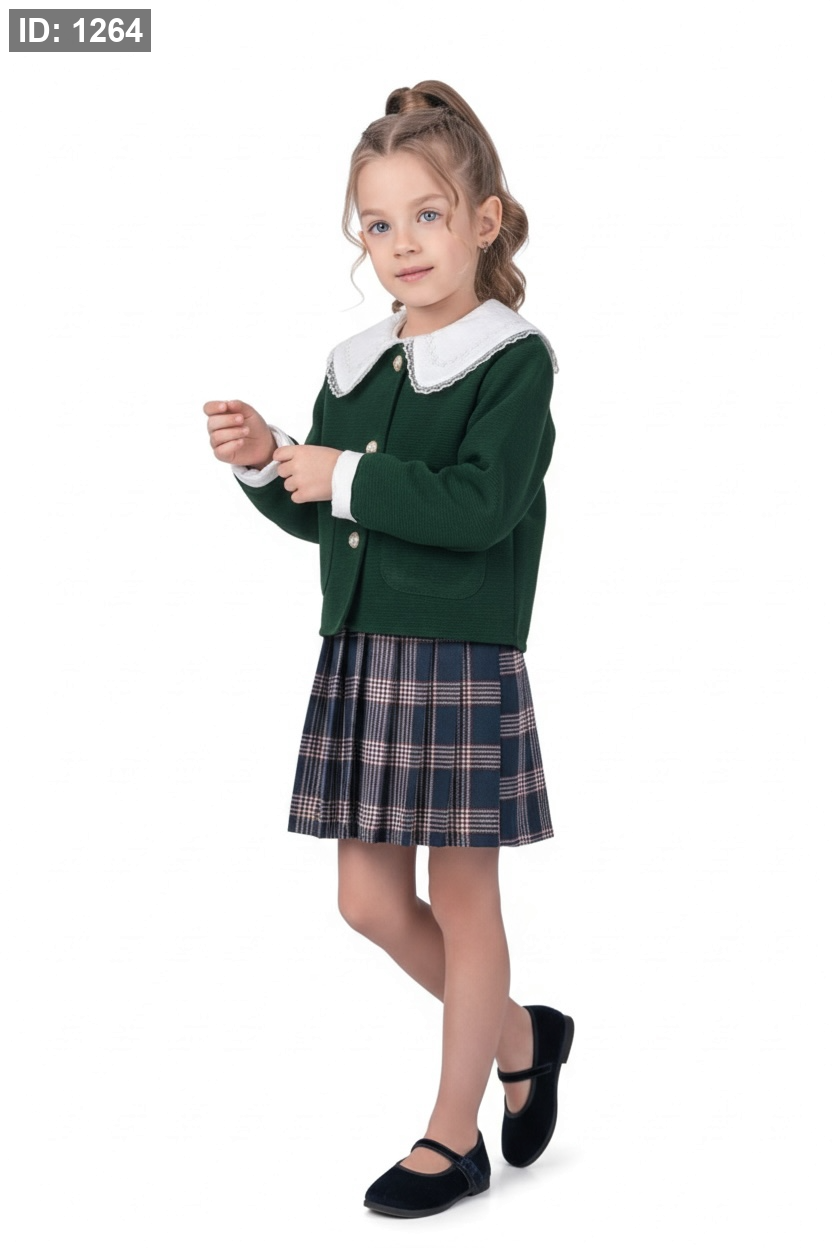 - طقم متكامل من 3 قطع - يتكون من جاكيت خارجي، قميص أبيض بياقة لؤلؤية، وتنورة كاروهات قصيرة، مما يمنح طفلتك مظهراً مرتباً وفخماً.