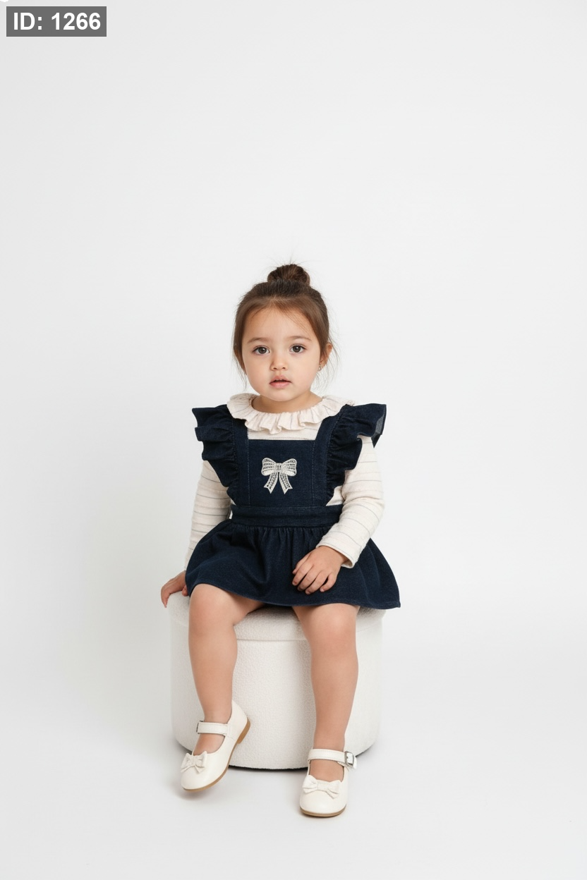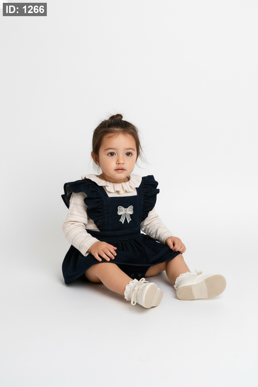 فستان كتف (Salopette) - باللون الكحلي الغامق، يتميز بقصة "الكرانيش" العريضة على الأكتاف التي تمنح الطفلة مظهراً مميزاً.