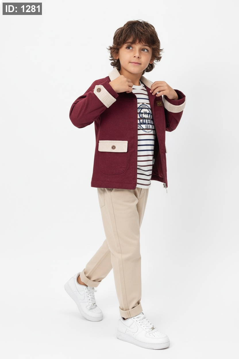 - تفاصيل التباين - الياقة، أطراف الأكمام، وقلابات الجيوب مصنوعة من قماش بلون كريمي فاتح بنقشة "الكوردروي" (المضلع)، مما يكسر حدة اللون الخمري ويضيف لمسة كلاسيكية.