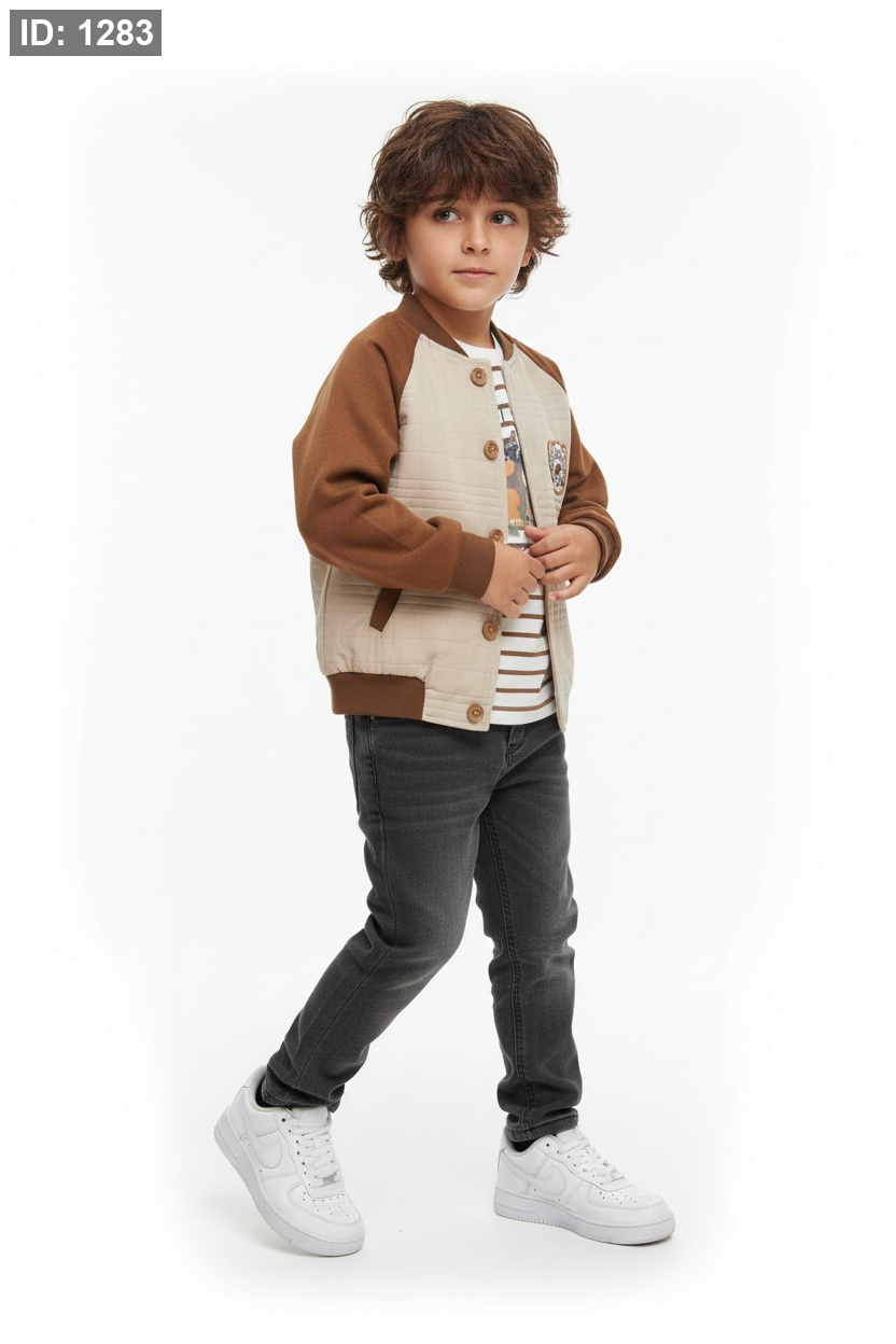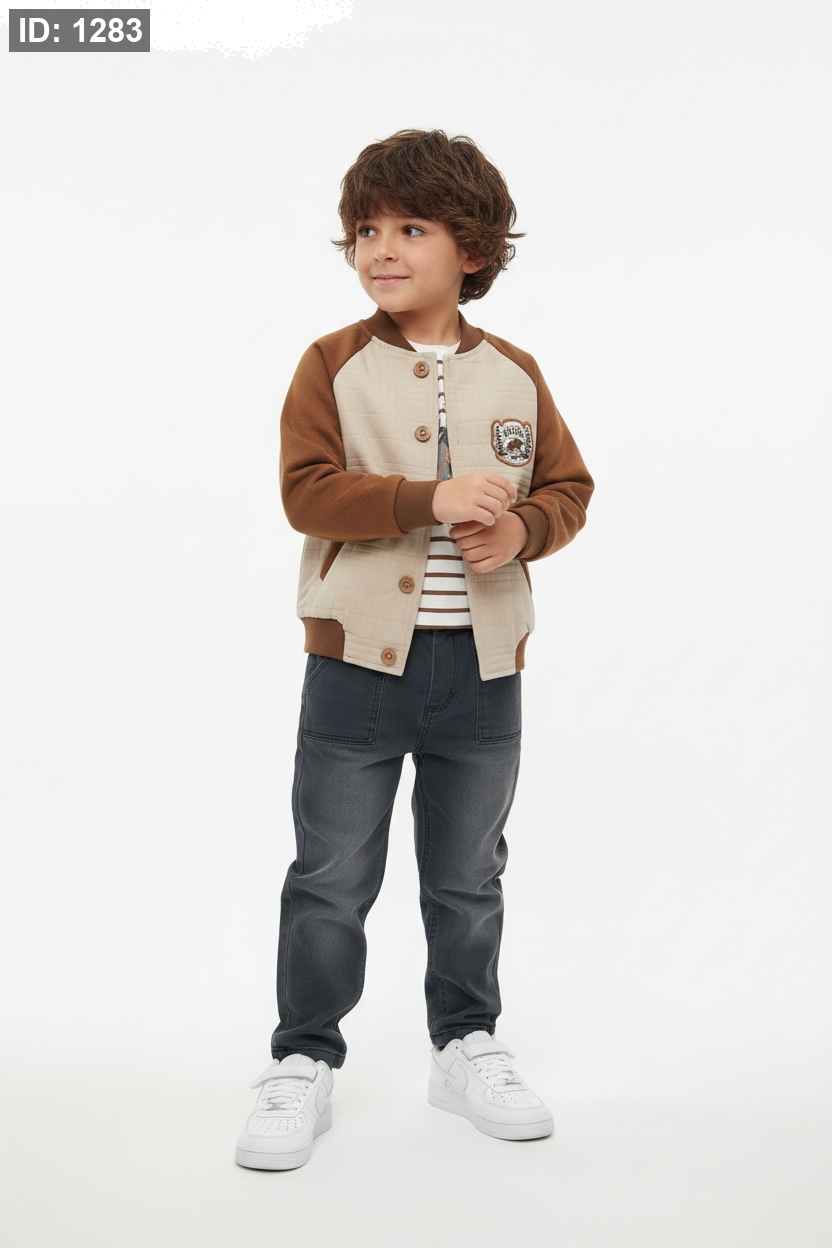 - اللون - جينز رمادي غامق (Charcoal)، وهو لون عملي جداً للأطفال ويتناسب تماماً مع الدرجات الترابية (البني والبيج) الموجودة في الجاكيت.