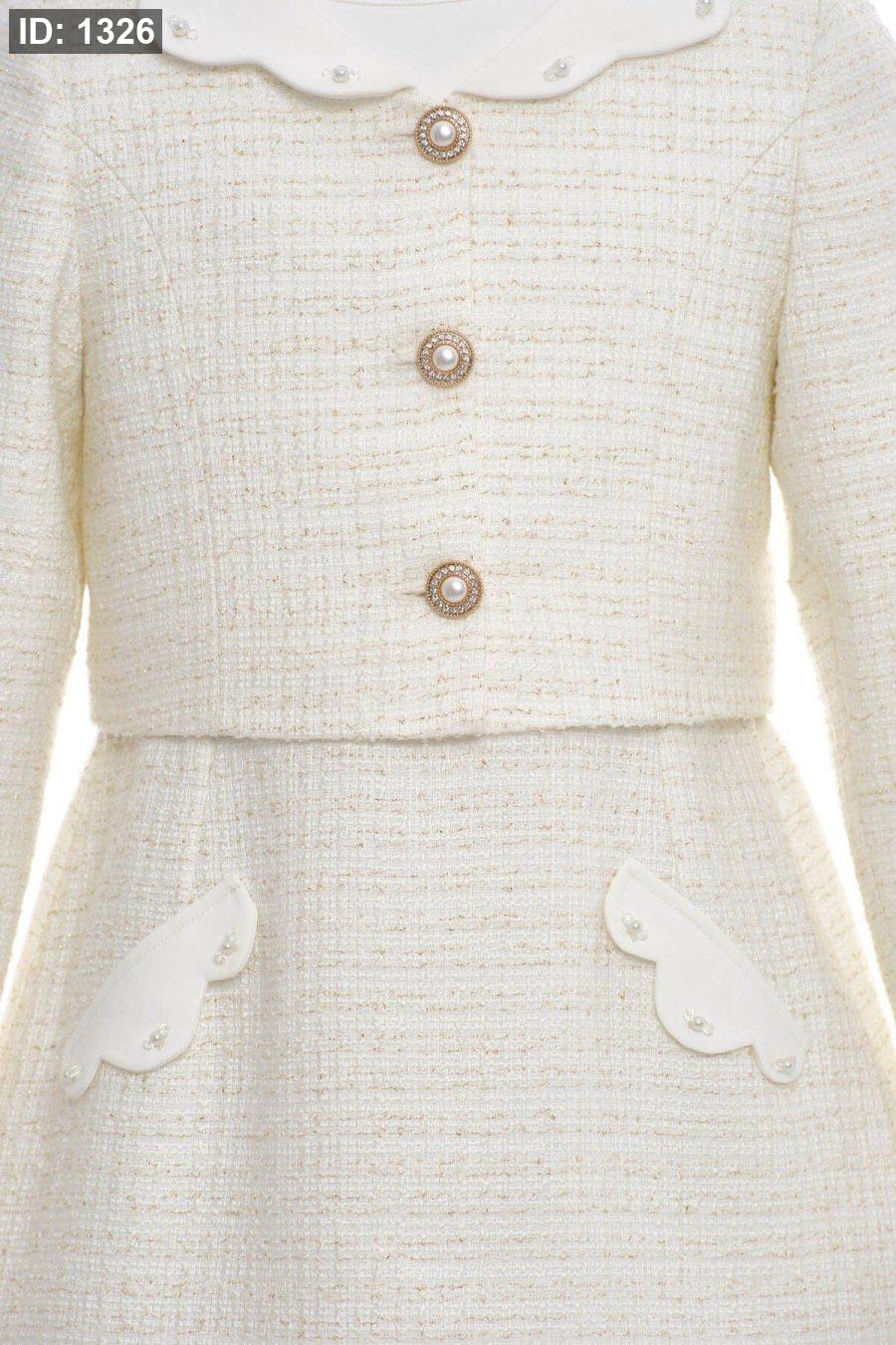 جيوب وهمية مزخرفة - يتميز الفستان بوجود جيبين وهميين على الجوانب، بفتحات متموجة مزينة بحبات اللؤلؤ لتتناسق مع تصميم ياقة الجاكيت.