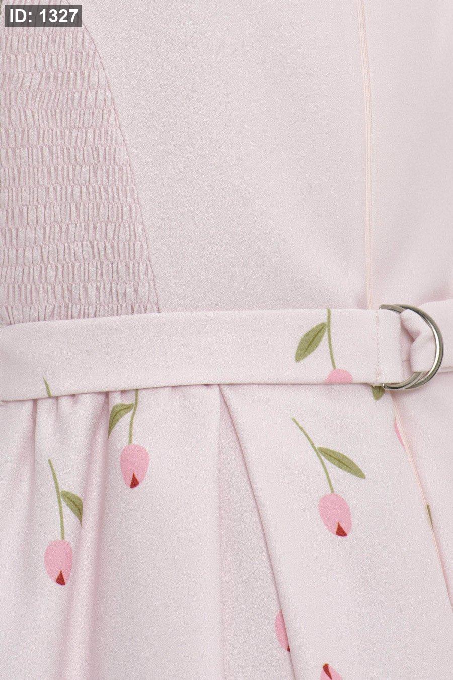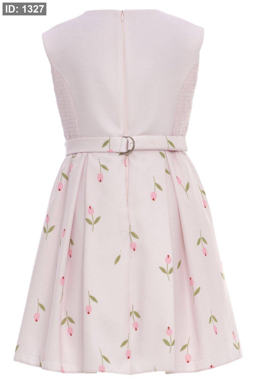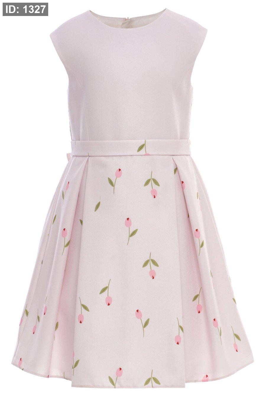 نقشة التوليب - تنورة الفستان مزينة برسومات ناعمة لأزهار "التوليب" الموزعة بشكل رقيق، مما يضفي لمسة ربيعية حيوية.