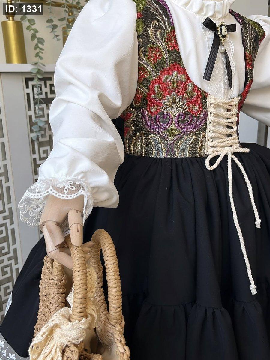 حواف الدانتيل الواسعة - ينتهي الفستان من الأسفل بطبقة عريضة من الدانتيل الأبيض المخرم، مما يكسر حدة اللون الأسود ويضيف تناسقاً مع الياقة والأكمام.