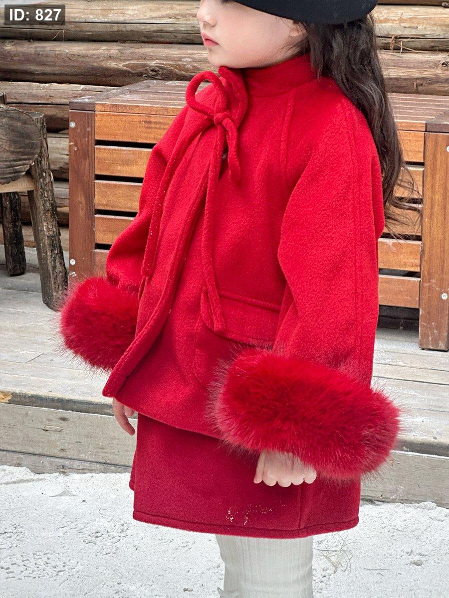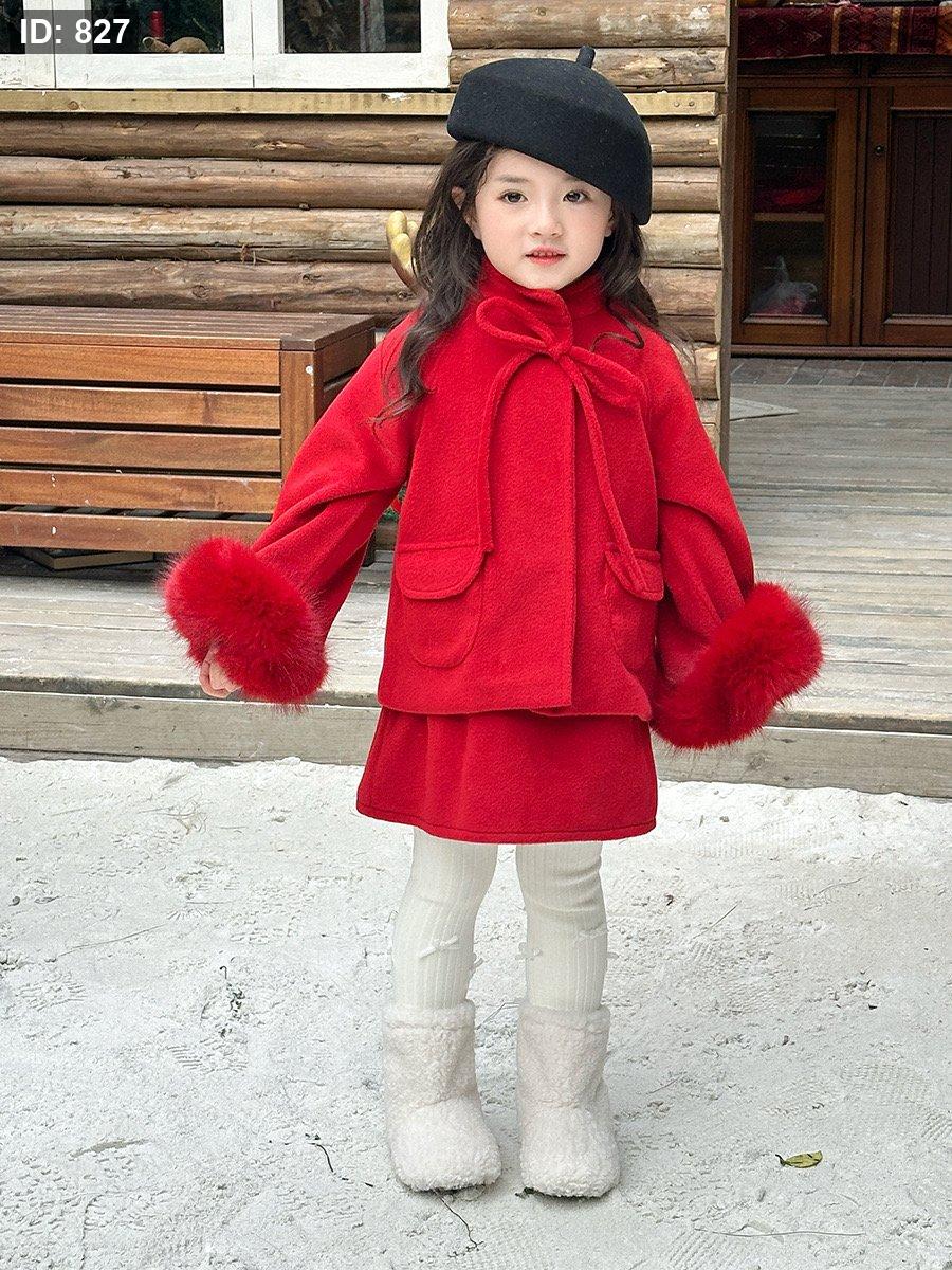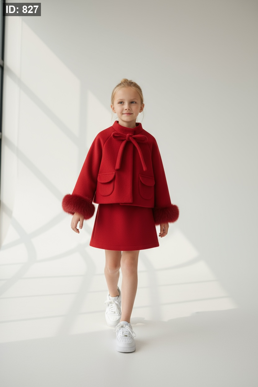 •الجاكيت مصنوع من خامة سميكة دافئة بلون أحمر فاخر، مزوّد بربطة أنثوية عند الرقبة لإضافة لمسة كلاسيكية.