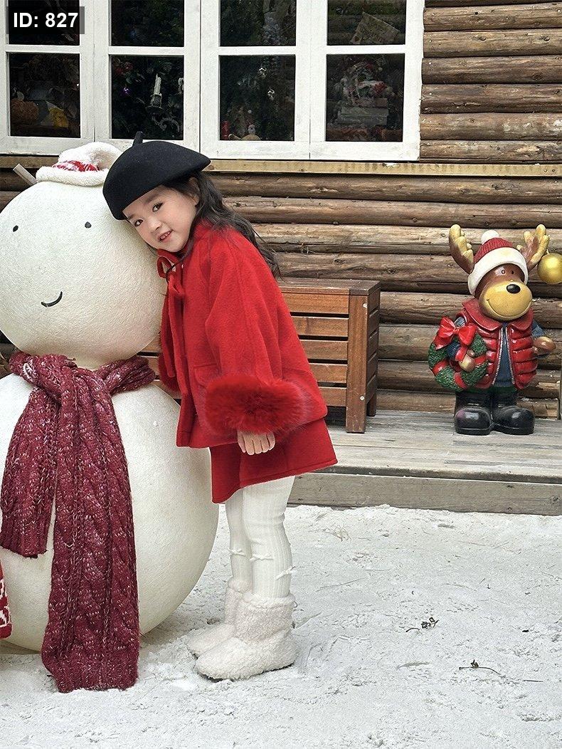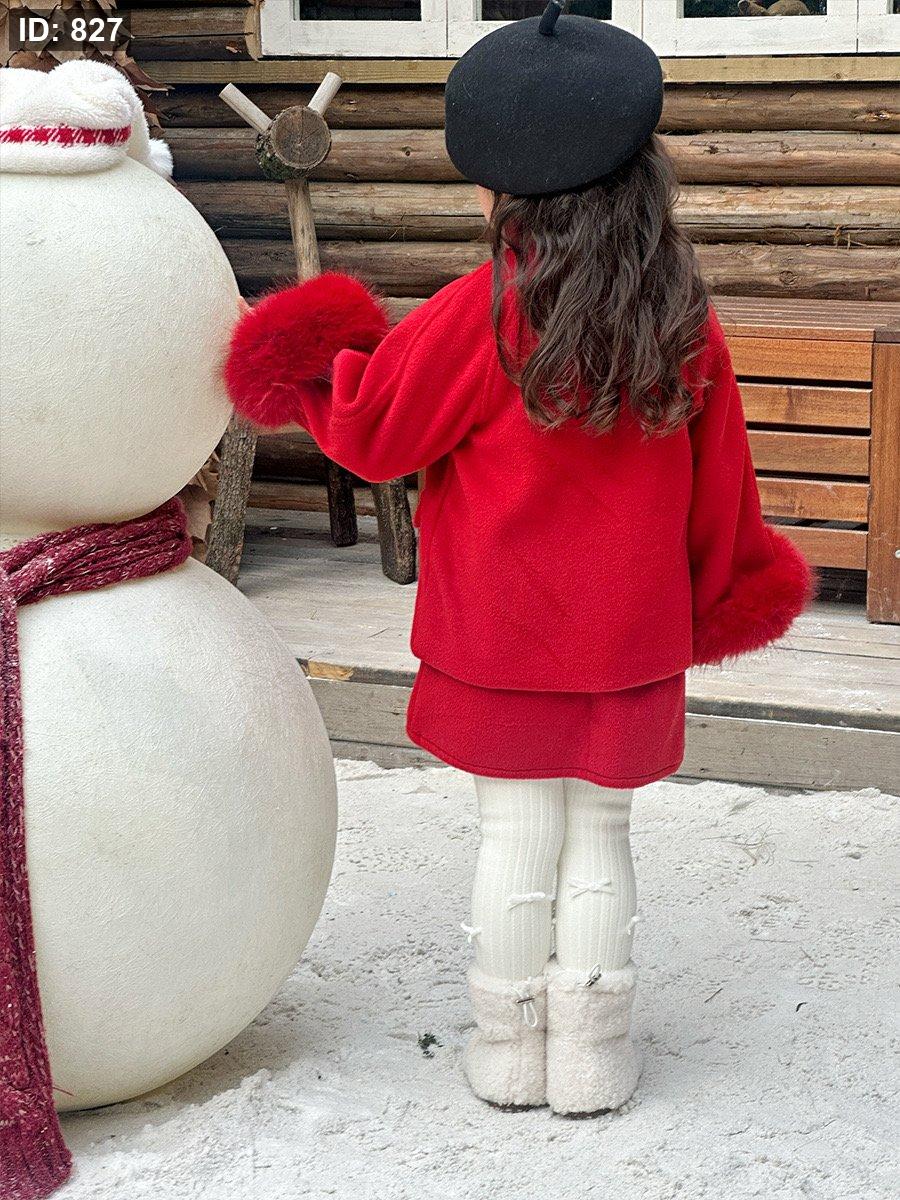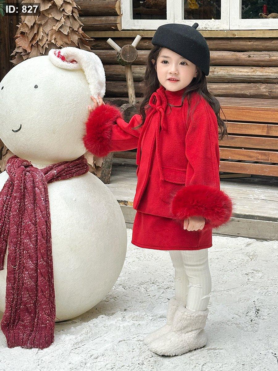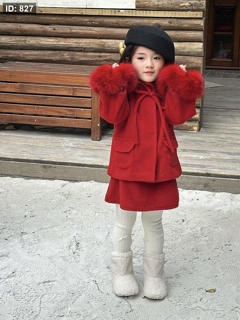 •الجاكيت مصنوع من خامة سميكة دافئة بلون أحمر فاخر، مزوّد بربطة أنثوية عند الرقبة لإضافة لمسة كلاسيكية.